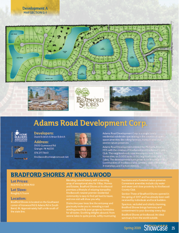 Adams Road Development entered the Michiana Area in 1975 with the creation of Knollwood and Knollwood Country Club. The neighborhoods now encompass over 3,400 home sites, on 3,000 acres, in 20 neighborhoods, and 30 Lakes. The developments have grown to be known as the Communities of Knollwood and currently span over 2 states, 3 townships and 3 school districts.