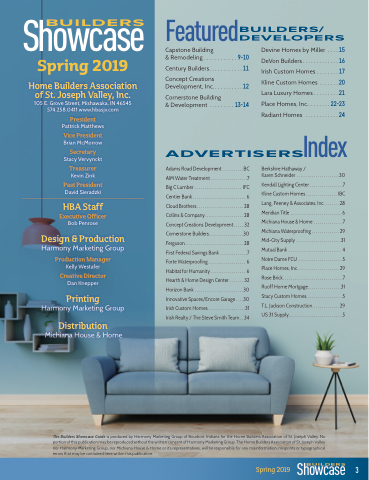 The Builders Showcase Guide is produced by Harmony Marketing Group of Bourbon, Indiana for the Home Builders Association of St . Joseph Valley . No portion of this publication may be reproduced without the written consent of Harmony Marketing Group . The Home Builders Association of St . Joseph Valley nor Harmony Marketing Group, nor Michiana House & Home or it’s representatives, will be responsible for any misinformation, misprints or typographical errors that may be contained here within this publication .