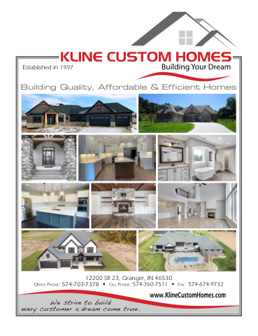 Established in 1997 Building Quality, Affordable & Efficient Homes 12200 SR 23, Granger, IN 46530 OFFICE PHONE: 574-703-7378 • CELL PHONE: 574-360-7511 • FAX: 574-674-9732 We strive to build every customer a dream come true. www.KlineCustomHomes.com